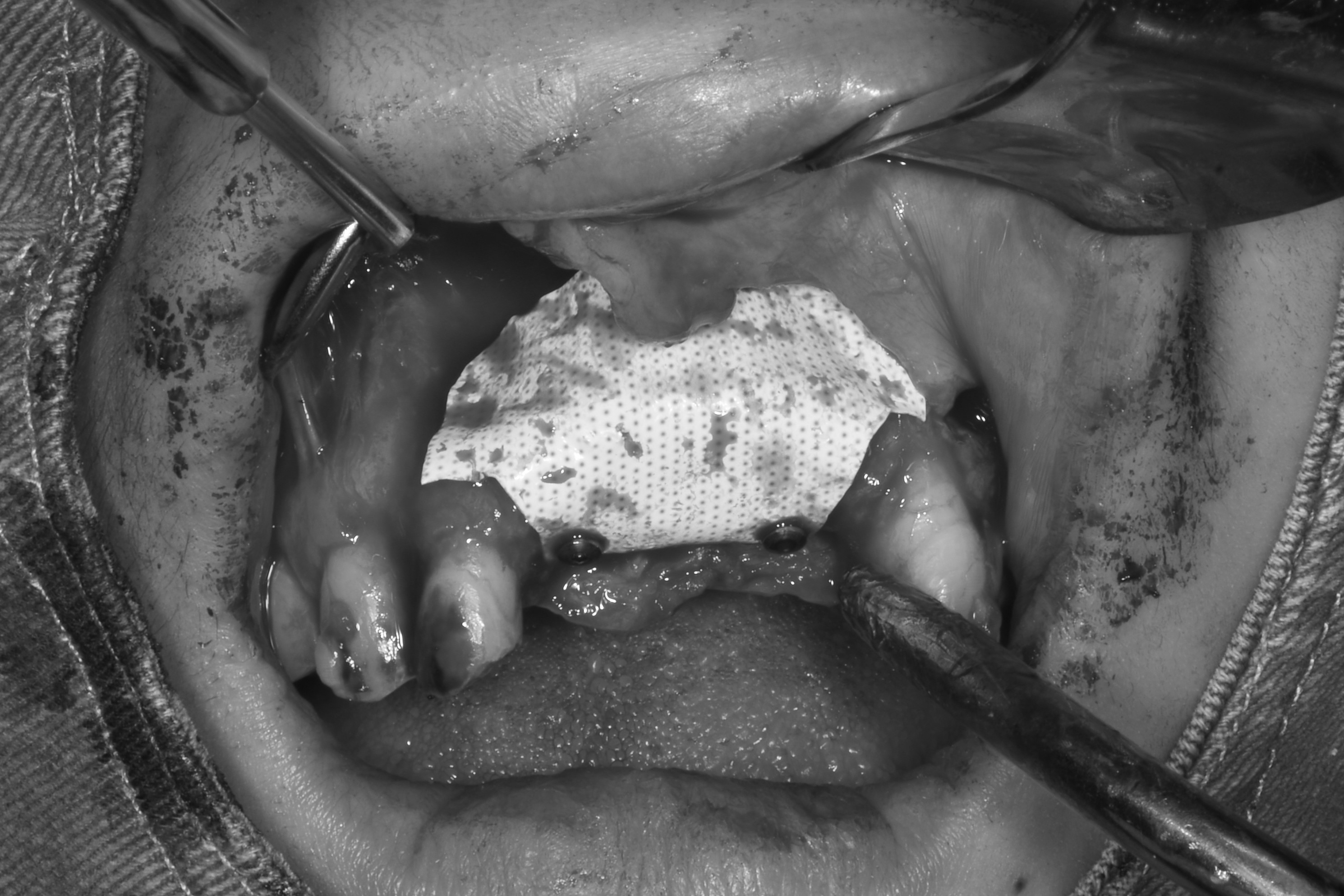 翻瓣補骨的區域,先擷取所需不可吸收骨膜的大小,用骨釘固定
